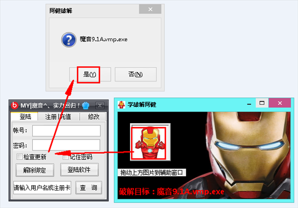 将补丁中的钢铁侠小按钮拖拽到辅助中即可破解