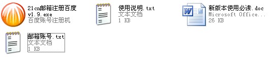 用过的21cn邮箱账号会保存到同目录下“已用21cn邮箱账号.txt”;注册成功的百度账号会保存到“\帐号\baidu.aji”,用记事本打开即可看到。