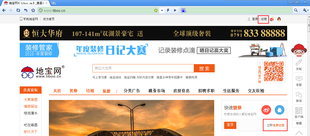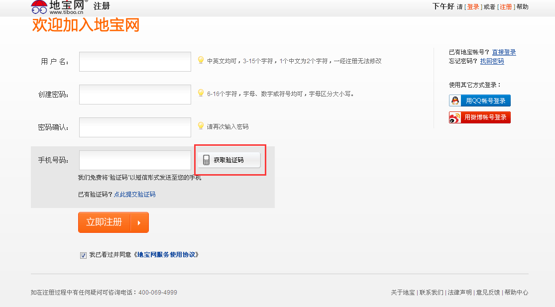 打开地宝网点击页面右上角的“注册”,或右侧的“免费注册”。