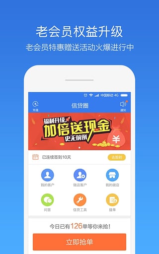 信贷员移动获客平台。移动获客,实时接单,智能匹配,接单到手软。作为一款集获客、展业、同行业沟通、一手信息获取等功能于一体的信贷员终极工作平台,信贷圈一直致力于帮助信贷员通过移动端货客、同城交流及实现更好的订单管理。首创实时接单,主动出击获取优质资源,一分钟创建信贷员自有微店,点对点受理客户需求。信贷圈,为信贷员高效把握商机,成就梦想而服务。【更新日志】