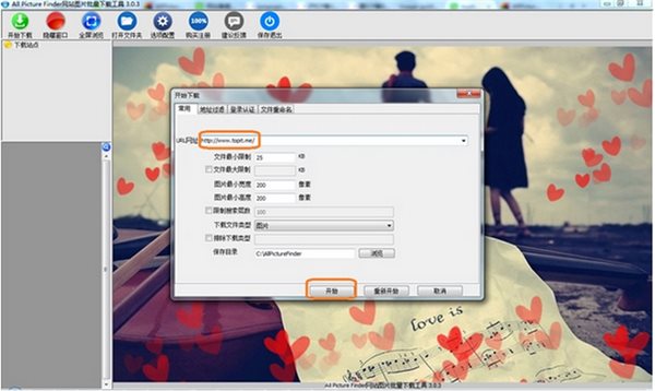 1.打开 All Picture Finder,录入URL网址,点【开始下载】按钮