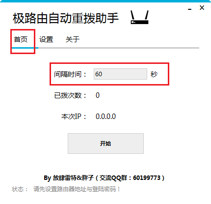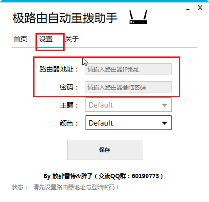 下载解压后,运行 极路由自动重拨助手.exe,打开软件,先点设置,设置好路由器地址及登录密码