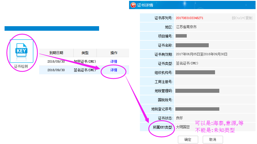 证书未正常识别说明:打开行助手2.0--证书检测--不显示证书名称(正常是1个签名证书1个加密证书),或,证书检测--详情--所属KEY类型--未知类型。解决办法,点击查看:11.png