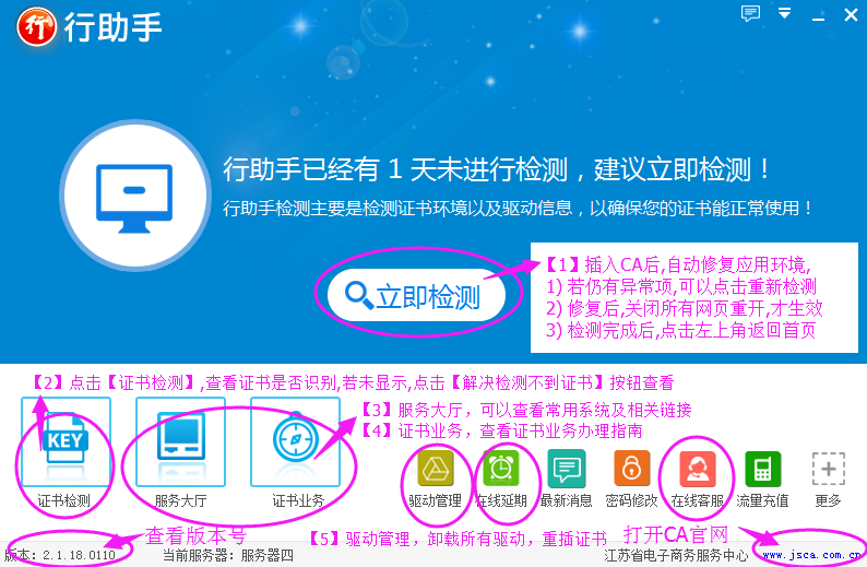起点提供行助手官方下载,行助手是江苏省行CA证书的驱动软件,主要用于管理和使用CA证书。行助手集驱动、控件、延期、检测、升级、服务等功能于一身,可对客户端,网络等进行各项检测,同时把检测到的问题告知用户, 方便客户发现问题、解决问题,并可对证书使用环境进行客户端和网络的智能修复。