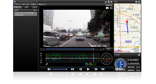 整合提供七大行车信息:影像、地图、轨迹、坐标、方向、时间和速度,还原突发事件的现场依据。创新提供“点对点”比对功能,点选轨迹上任意位置,即可同时看到该位置的影像资料,与地图位置相对应,让各项信息的比对更快捷、清晰。