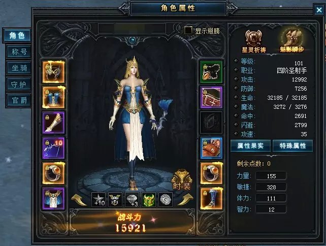 1角色左边是开启功能,中间显示战斗力和装备,右边显示人物属性和角色技能