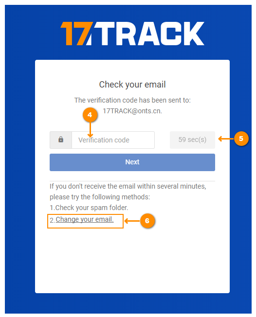 您需要几步操作来完成你的注册,输入您的常用邮箱,点击下一步,但如果您已经拥有17TRACK的账号,点击这里可以回到登录页面,输入您的账号进行登录