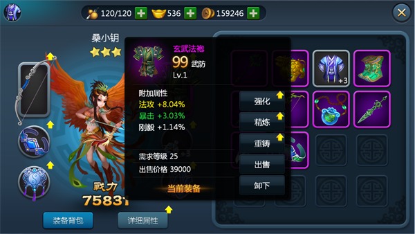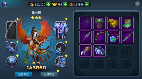 每个伙伴拥有6个装备部位,从左至右,从上到下,依次为武器、法袍、戒指、项链、奇物、战靴。