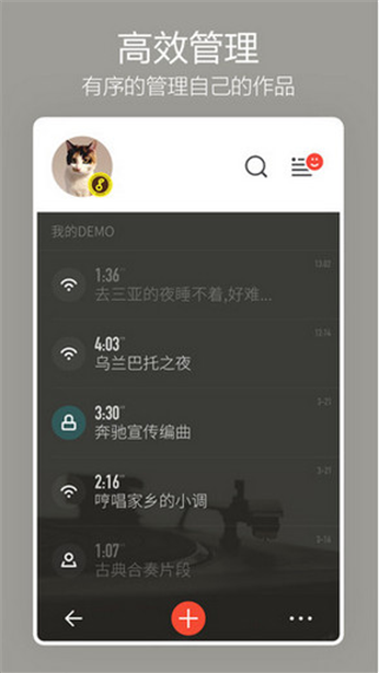 轻松录制、导入导出、管理你的音乐demo,不管是想保存收藏,还是想发给朋友,只需轻轻一点。好声音,好作品不怕没有听众,不管是微博,朋友圈还是qq空间,轻松分享,集赞必备。丰富多彩的列表展示内容。完备的权限设置,充分保护你的隐私。