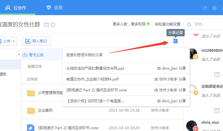 群列表右上方,可直接查看本群内有哪些文件正处在对外分享可见状况。