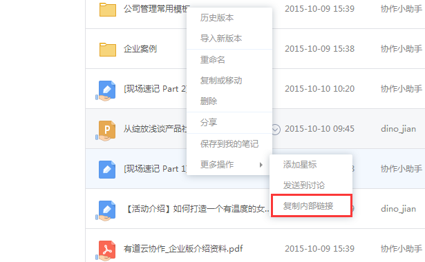 3.为方便群内文件间关联操作,可将文件生成“分享内链”,插入到其他群文件中。