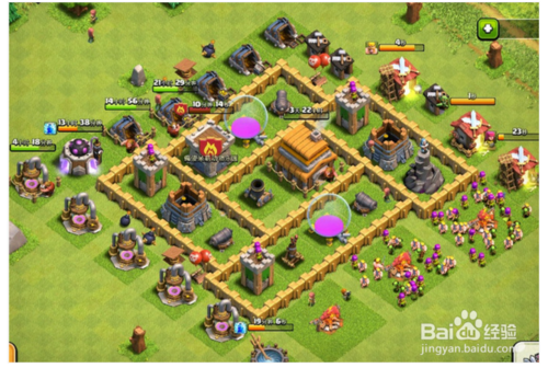 ②进攻时在城堡圈内下兵,或者说下兵让其进入这个圈。这里需要了解每个兵种的攻击偏好,如胖子的攻击偏好是防御设施,那么可以下一个胖子,胖子会去靠近防御设施从而进入部落城堡圈,触发援兵。