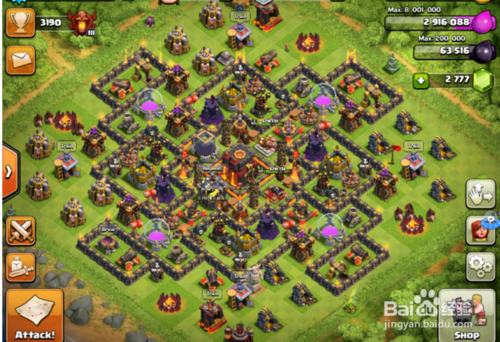 看的眼熟没有,没错这个就是网上盛传的七本引导神阵了,要是小编遇到这中阵基本上就是绕道走,再多资源也不敢偷啊。用胖子有资源的地方必有陷阱,何必去打呢,使用龙流,防空那么高并且呈三角型最主要的是去抢资源,龙流费用那么高根本不划算。