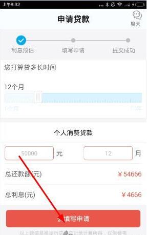 2、在申请贷款界面,进行利息预估,点击下方的去填写贷款申请按钮,