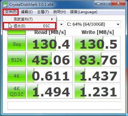 7、点选「文件\退出」,结束硬盘读写速度的检测。