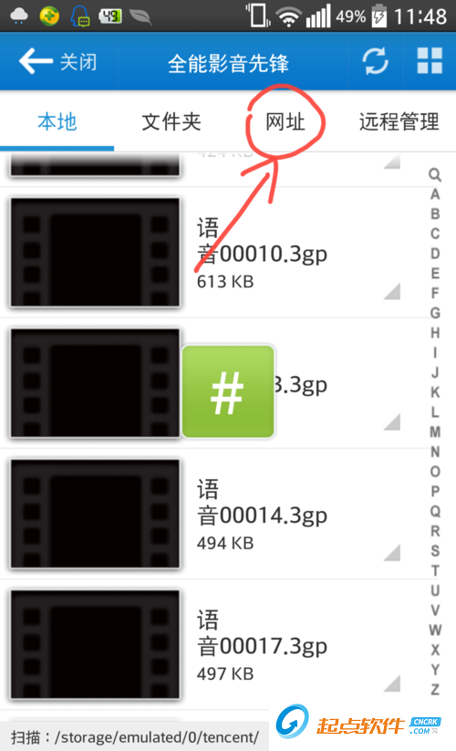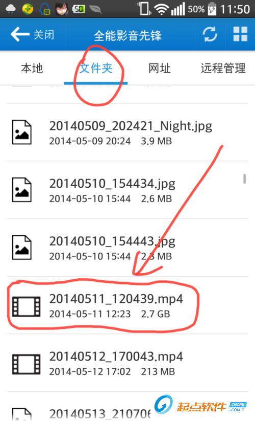 现在来看看主要的播放功能吧,看看效果如何,点击文件夹,可以查看手机上的视频的文件。点击一个进行播放。