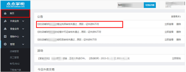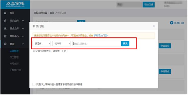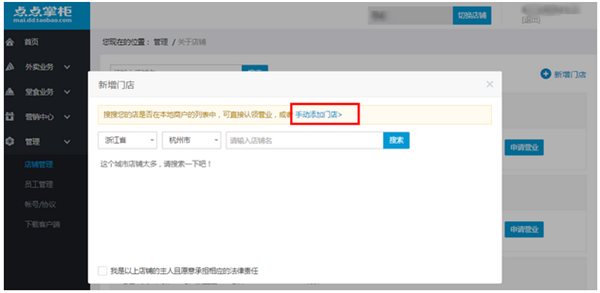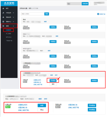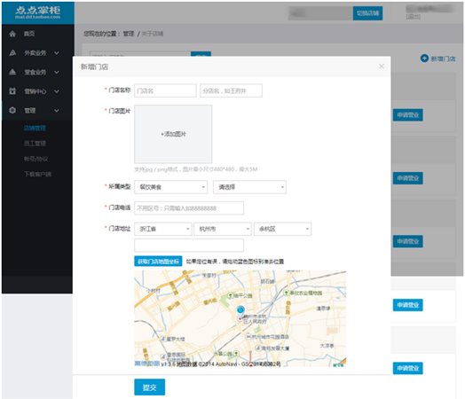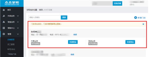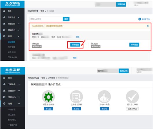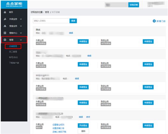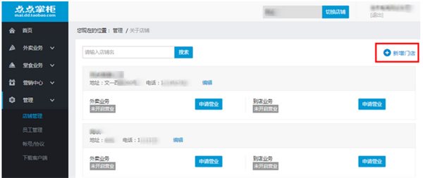 1:创建门店成功后,在点点掌柜-管理-店铺管理中,外卖业务模块点击申请营业
