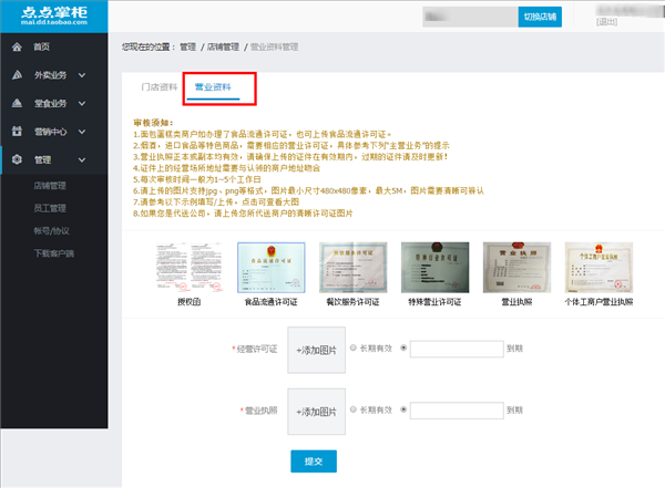 3:上传营业资料,需要上传营业执照、许可证、授权函