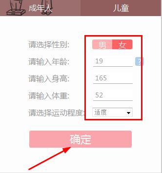 1、用户可根据测试对象选择儿童或者成年人,然后选择性别,按身高和体重输入数值,点击计算;