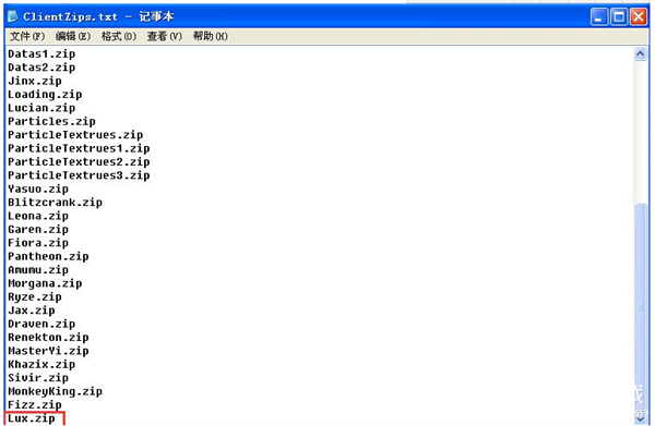 然后挂载。挂载就是你把自己已有的zip格式的皮肤或包重命名为一个不带汉字的名字。这里可以任意发挥,只要不带汉字即可,我一般是以该英雄的英文名字命名,然后就把这个zip皮肤文件复制进英雄联盟的Game子文件夹里面,然后在这个game文件中的ClientZips.txt里的最后一行将刚刚修改过的不带汉字的压缩文件名复制进去,这个过程统称挂载。随着挂载的完成,咱们的皮肤修改也大功告成,这样运行游戏就会自动执行了。