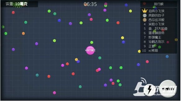 这个就是进入游戏后的画面 左上角是你的体重 也就是大小 越大 你的体积就越大 体积大的可以去吃体积小的 差不多体积的不能互吃