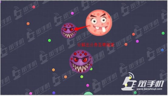 按减分裂法:将射出小球往精华分身(即最大分身)的移动方向走,然后点击闪电,移动最大分身吃小分身,优点是能快速吸食分身,缺点是重量损失较多。