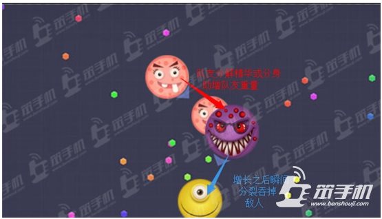 组团分裂法:团战中让队友吞噬自己的部分分身,再让队友吐小球给你吸食,优点重量不易损失,同时用尖刺能快速增重,缺点速度较慢,分身易被其他敌人吞噬掉。
