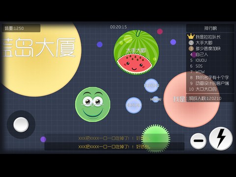 4.【速分法(快速分身法)】(自创)虽然此技术可以惯用减号分身达到快速的效果,但是分身也是有个度的。在团队模式中,当你的体重大于你的球友分身,你分出来的分身体重也大于球友,这时点击减号,往后拉(不使用往后拉前面分的身会被敌球所吃掉,达不到配合)本技术教程完毕