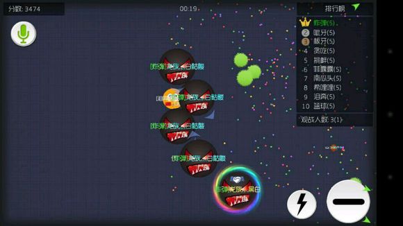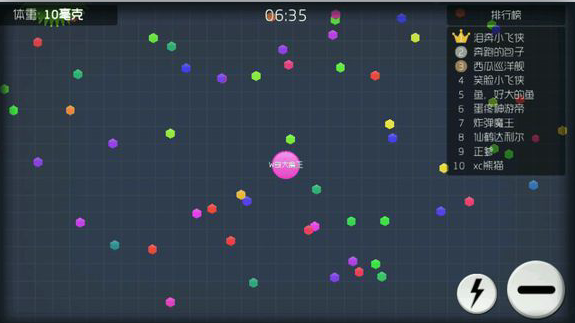 右下角闪电是发射一个小球 小球可以让别人吃让他们变大 也就是说可以去喂别人 但是发射小球会减少你的体重 旁边的减号是分裂 比如你现在是个打球点击分裂即可分裂出两个一样大的球 点击2次即可分裂4个 以此类推