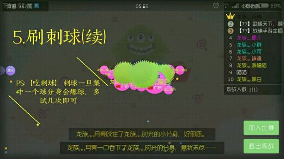 14.【扫身法】此技术为何叫做扫身呢?用意何在接下来为大家简介及操作步骤。简介:扫身法,就是扫除球友身上的小分身。操作:1.当球友分身多时,可采取围绕球友身边吃掉球友的分身,绕距:以圆圈为主绕行即可。2.当球友体重小于你的分身时,即可分身吃。