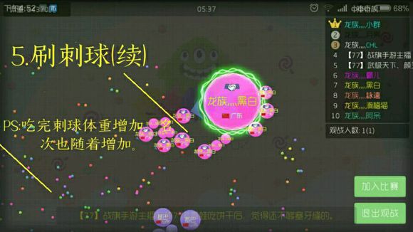 5.【刷刺球】在团队模式中,刷刺球是可以的,只不过开始必须要两个人配合一个人在旁边刷刺,另一个在旁边守护。(刷刺操作技巧)分身吐净(吐16个分身为吐净)点击屏幕暂停,然后点击闪电(全部的球会集中在一个球的身上)在旁边找刺(绿色齿轮)向刺球吐球,不停的吐最后把刺球吃掉即可(不会爆球)