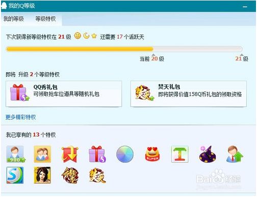 3、超级QQ体验特权。QQ等级从16级起每增加8级即可获得一个5天的超级QQ体验礼包。
