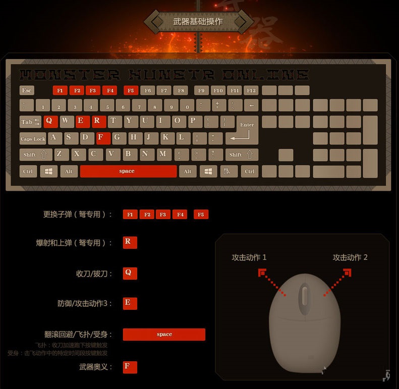 狩猎笛操作:左键-左抡,右键-右抡,鼠标中键前-大地一击,鼠标中键后-连续刺,鼠标中键按下就是演奏,当开始演奏时鼠标滚轮的前后则变成不同的演奏音色而不是技能;