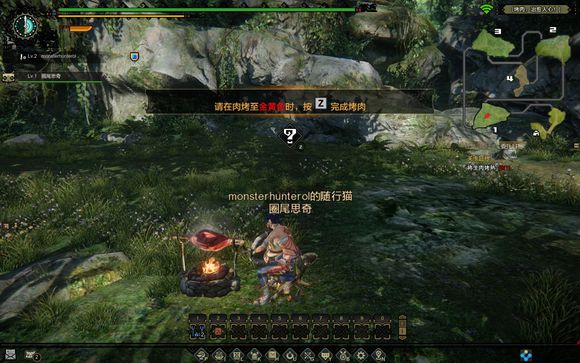 在身上携带烤肉架和生肉的状态下,在猎场中按下烤肉架的快捷键,将进入烤肉状态。