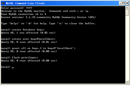 下面在MySQL服务器中创建一个bugs数据库,和一个bugs用户,以及为该用户授予相应的权限,命令如下: