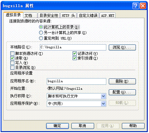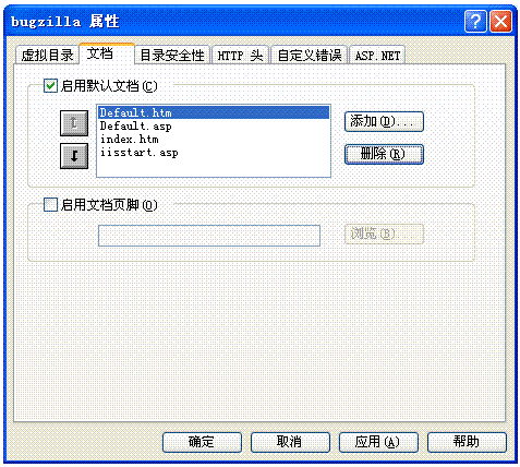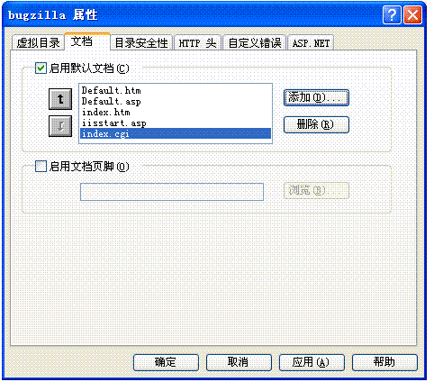 在bugzilla属性对话框中选择文档,在默认文档中选中添加