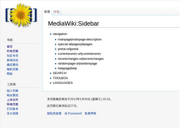 如,http://localhost/mediawiki/index.php/MediaWiki:Sidebar,或者在搜索栏中输入“mediawiki:sidebar”,进入页面后点击编辑即可。