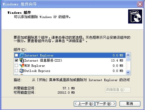1、打开我的电脑到“添加或删除程序”中的“添加或删除Windows组件”去安装,选择Internet 信息服务(IIS)如下图。