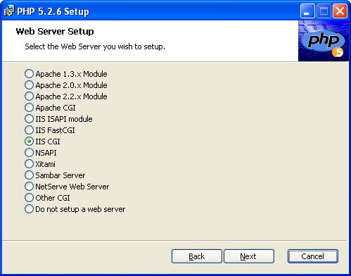 下载PHP5.2.6, 双击安装, 注意在安装过程中有对特定server的配置选项,见下图D。