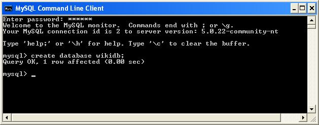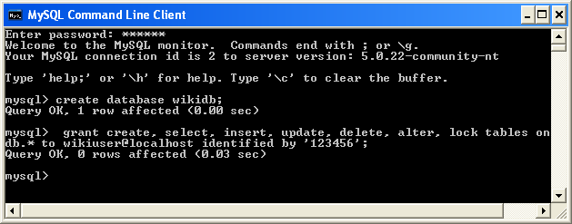 回车,返回Query OK, 1 row affected. 说明wikidb已经建立好了。