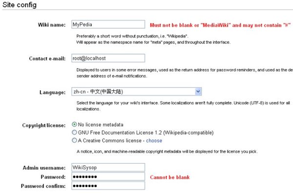 首先得第一项配置是针对站点的配置。如下图,Wiki name为你的Wiki的名字,Language选中文,Admin user name和password可以自行设置。