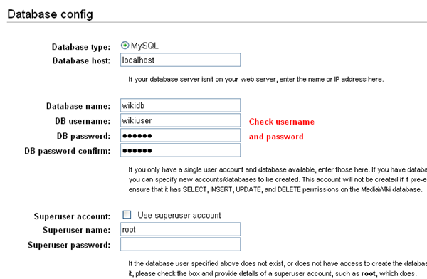 E-mail config可以不进行设置,接下来的Database config配置数据库的信息,如下图,DB username和password输入在新建wikidb时新建的用户,即wikiuser和123456。