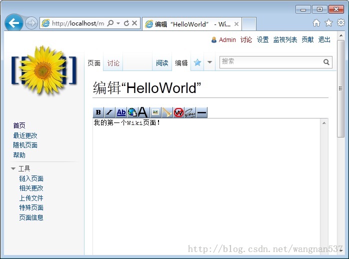 输入http://localhost/wiki/index.php, 就可以进入首页了!