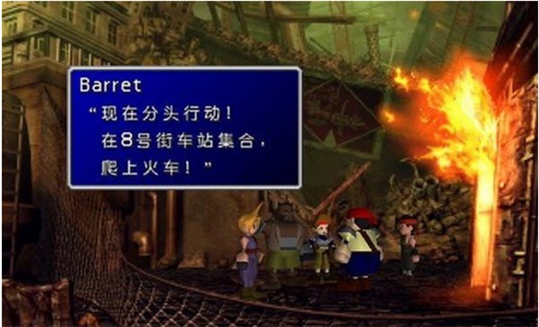 趁他们一个不留神便往下跳,火车正在克拉特身下掠过。如长蛇的烈车继续开动,往冰冷的终站—火车墓场前进,火车上反神罗组织讨论着。