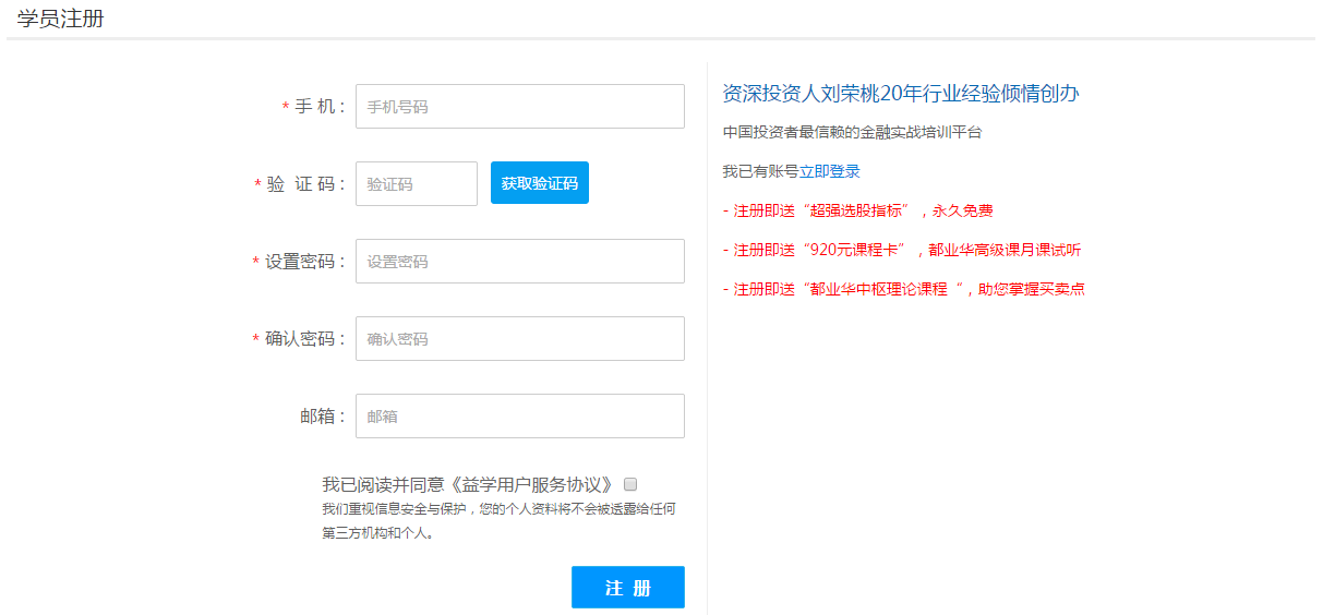 打开益学堂登录窗口,使用注册的账号或手机号码登录。登录后,可以享受收藏课程、向讲师提问等个性化服务。