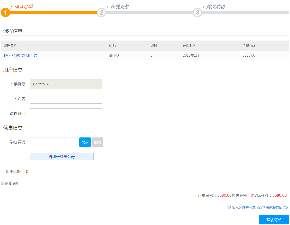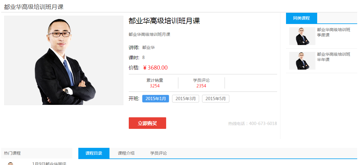 第一步:在高级课程页面,选择开班时间,点击“立即购买”;按钮到订单结算页面;