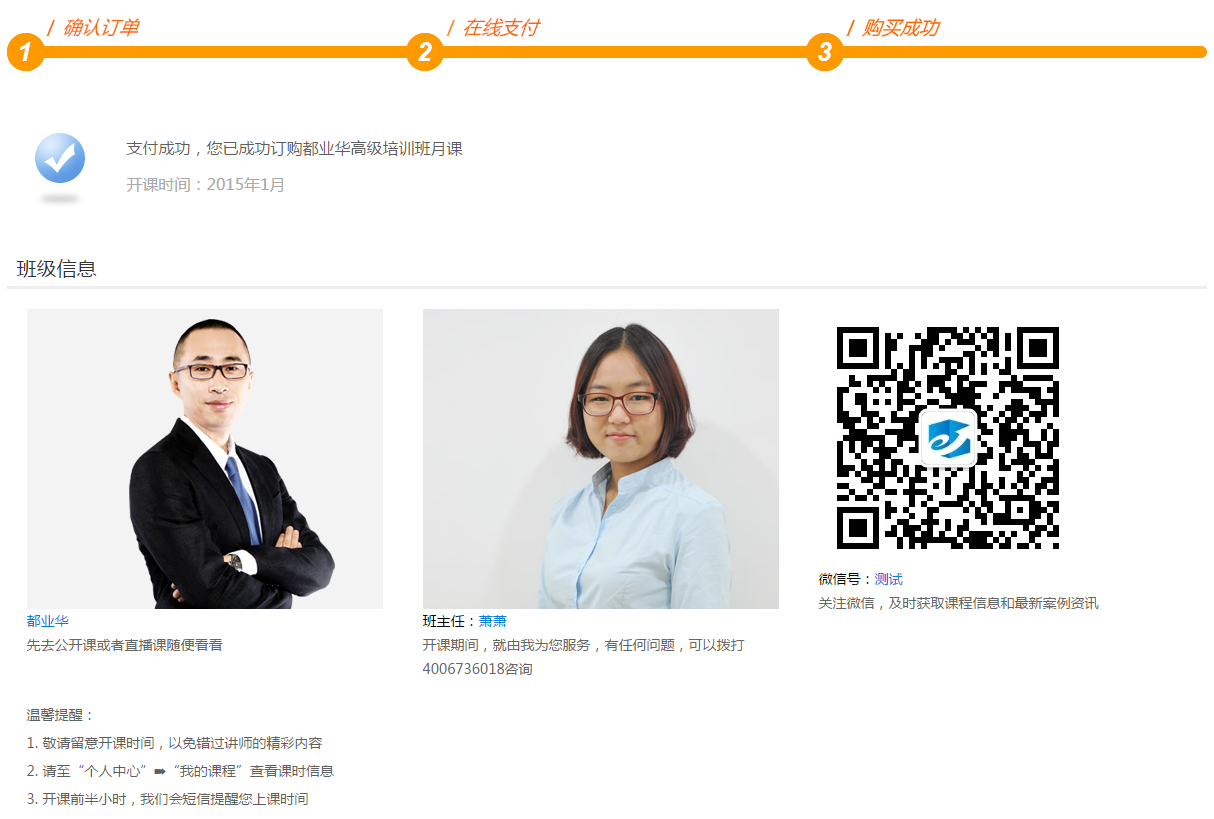 第四步:支付成功,获取班级信息,您可以与班主任取得联系,或加入微信号;