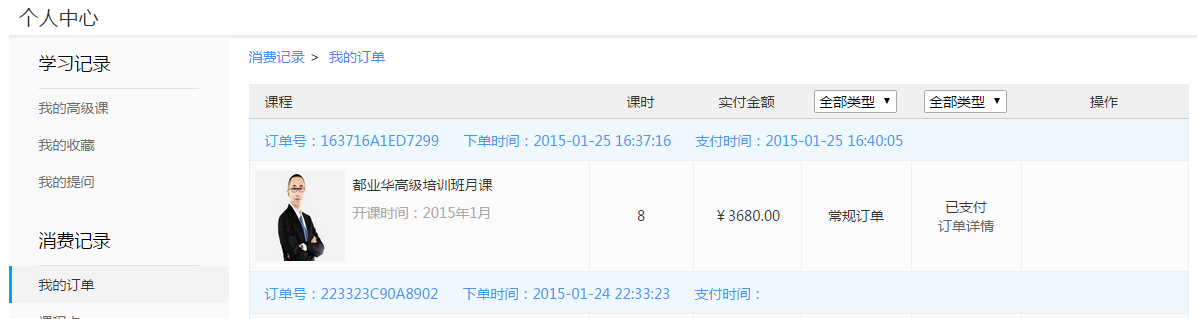 第五步:到“个人中心” → “我的订单”页面,查看购买记录。