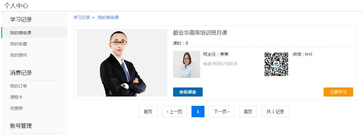 第一步:打开“个人中心” → “我的高级课”页面,选择听课课程;