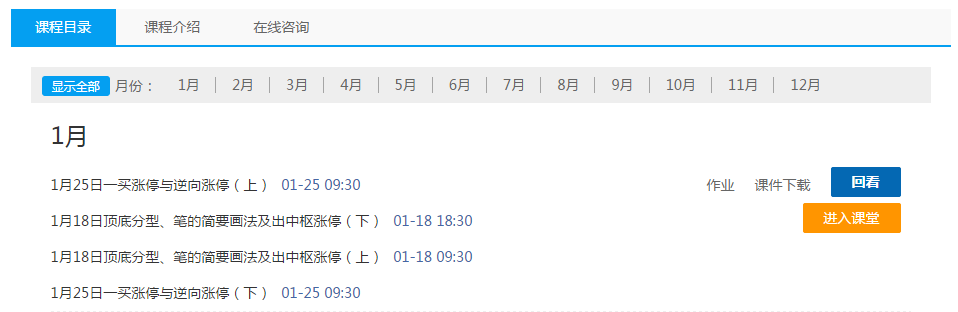 第二步:按课时听课;如果是直播时间,可“进入课堂”;如果已过直播时间,可“回看”录播课程;也可下载课件和作业。